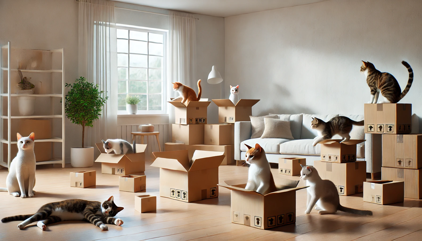 A realistic image of cats enjoying themselves with boxes in a clean, cozy room.